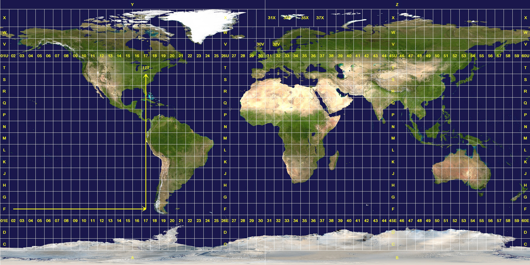 Das UTM-Koordinatensystem projiziert die Erdoberfläche auf ein flaches, rechtwinkliges Gitter mit vielen kleinen Zonen